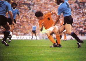 | Cruijff attorniato dalla difesa uruguayana (footballpoetssociety.blogspot.com) |