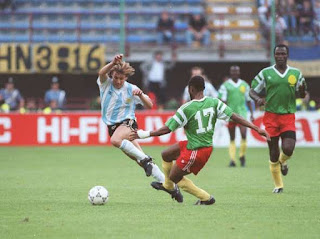 La partita d’esordio del Mondiale 1990 vede subito una grandissima sorpresa: l’Argentina, campione del mondo in carica, viene battuta 1-0 dal Camerun, in un girone che comprende anche Romania e Urss. La squadra di Bilardo è irriconoscibile, a partire dal proprio totem Maradona, che al momento appare il lontano parente del fuoriclasse incredibile ammirato quattro anni prima in Messico. Il Camerun vince con pieno merito, chiudendo addirittura in nove uomini, grazie a un colpo di testa imperioso di Omam Biyik, aiutato dalla papera del portiere argentino Pumpido.