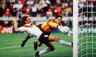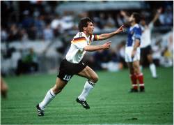 40′ GOL GERMANIA OVEST Splendida azione dei tedeschi. Da Augenthaler, palla sul lato sinistro a Brehme, cross perfetto a centro area, colpo di testa in tuffo di Klinsmann e pallone nell’angolino opposto.