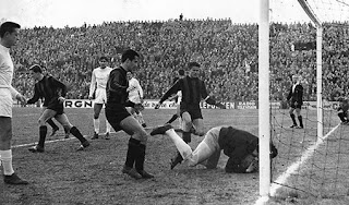 22′ altra azione sontuosa del Real. Da Rial la palla giunge a Puskas, che di prima apre a destra per Herrera, murato al momento del tiro a colpo sicuro.