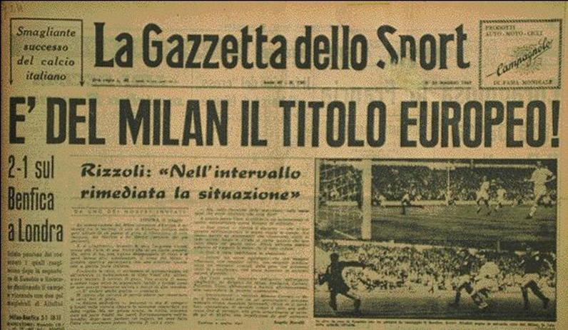 Prima Coppa Campioni per il Milan, prima Coppa Campioni per una squadra italiana. I rossoneri superano 2-1 il Benfica, reduce da due successi consecutivi nella competizione. Vittoria meritata della formazione allenata da Nereo Rocco, che costruisce più occasioni da rete degli avversari e sfrutta l’infortunio di Coluna, faro del gioco lusitano. E’ un successo di squadra quello dei rossoneri: ogni giocatore dà un contributo importante, dal portiere Ghezzi al fantasista Rivera, passando per il leader difensivo Cesare Maldini e l’ala Mora. Anche se il giocatore in più è Josè Altafini, autore della doppietta decisiva che ribalta l’iniziale svantaggio firmato da Eusebio.