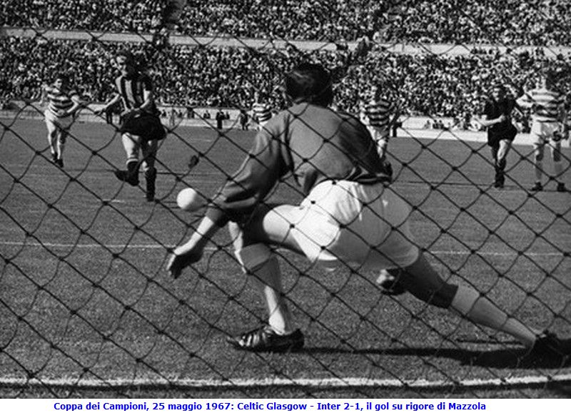 17′ GOL CELTIC GLASGOW Azione manovrata del Celtic, Craig da destra passa al limite a Gemmell, bordata pazzesca e pallone che si infila nel “sette”, imparabile per Sarti. Il Celtic trova un pareggio meritato, ma proprio nel momento in cui l’Inter sembrava aver finalmente preso le misure al gioco scozzese.