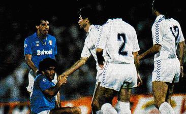 Non riesce l’impresa al Napoli: gli azzurri, battuti 2-0 al Bernabeu, non vanno oltre l’1-1 nel ritorno al San Paolo e vengono eliminati. L’inizio della squadra italiana è ottimo, ma con il passare dei minuti emerge la maggior esperienza degli ospiti, bravi a trovare il pareggio sul finire del tempo e gestire poi senza eccessive preoccupazioni nella ripresa. Il momento di svolta del match avviene probabilmente poco prima del pareggio spagnolo, quando Careca spreca solo davanti a Buyo una clamorosa chance per il 2-0 che avrebbe forse cambiato l’intera inerzia dell’incontro.