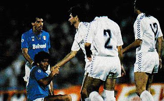 Maradona 6,5: controllato a vista da Chendo, spesso raddoppiato se non triplicato. Impossibile portargli via il pallone, i difensori del Real Madrid sono sempre costretti a fermarlo con le cattive. Sempre bravo a innescare i compagni e raffinare la manovra, forse – vista l’importanza della posta in palio e l’obbligo del recupero – potrebbe forzare di più qualche soluzione individuale. Globalmente, comunque, una prova discreta, sicuramente migliore di quella del Bernabeu.