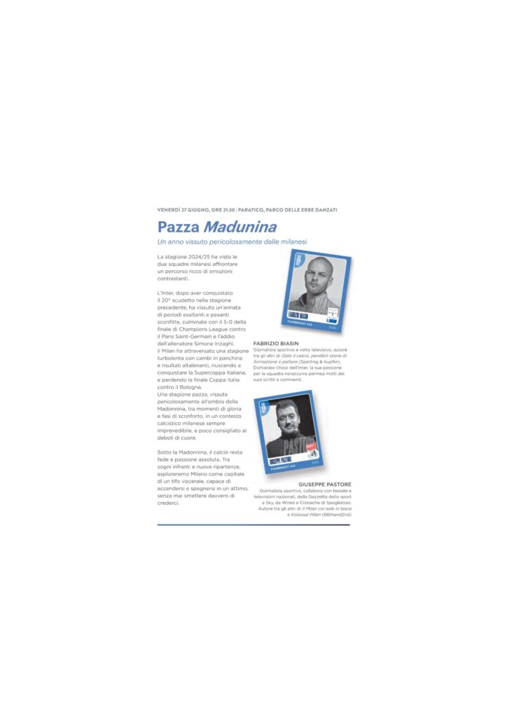 E non dimentica chiaramente l’attualità, con una serata dedicata alla complessa e affascinante stagione delle squadre milanesi (ospiti Giuseppe Pastore e Fabrizio Biasin) e con un evento celebrativo dello scudetto del Verona, forse l’impresa più grande e per certi versi irripetibile della storia del calcio italiano.