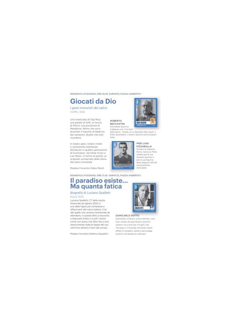 Domenica sera, il programma prevede la presentazione di altri due testi di primo piano nel campo della letteratura sportivo, ovvero degli ultimi lavori di Roberto Beccantini e di Giancarlo Dotto.