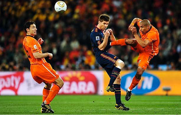 Le Furie Rosse allestiscono un centrocampo con i piedi di seta: Xabi Alonso, Busquets, Xavi, con Iniesta tra le linee e Villa come centravanti dai piedi buoni, senza dimenticare l’importantissimo impatto di Fabregas a partita in corso. L’Olanda risponde con una squadra corta, compatta, muscolare, dove la cerniera Van Bommel–De Jong è concepita per asfissiare e soffocare le scintille dei genietti iberici, con le buone, ma anche con le cattive, per poi affidarsi alla verticalità esplosiva di Robben, mai domo e spesso pericoloso.