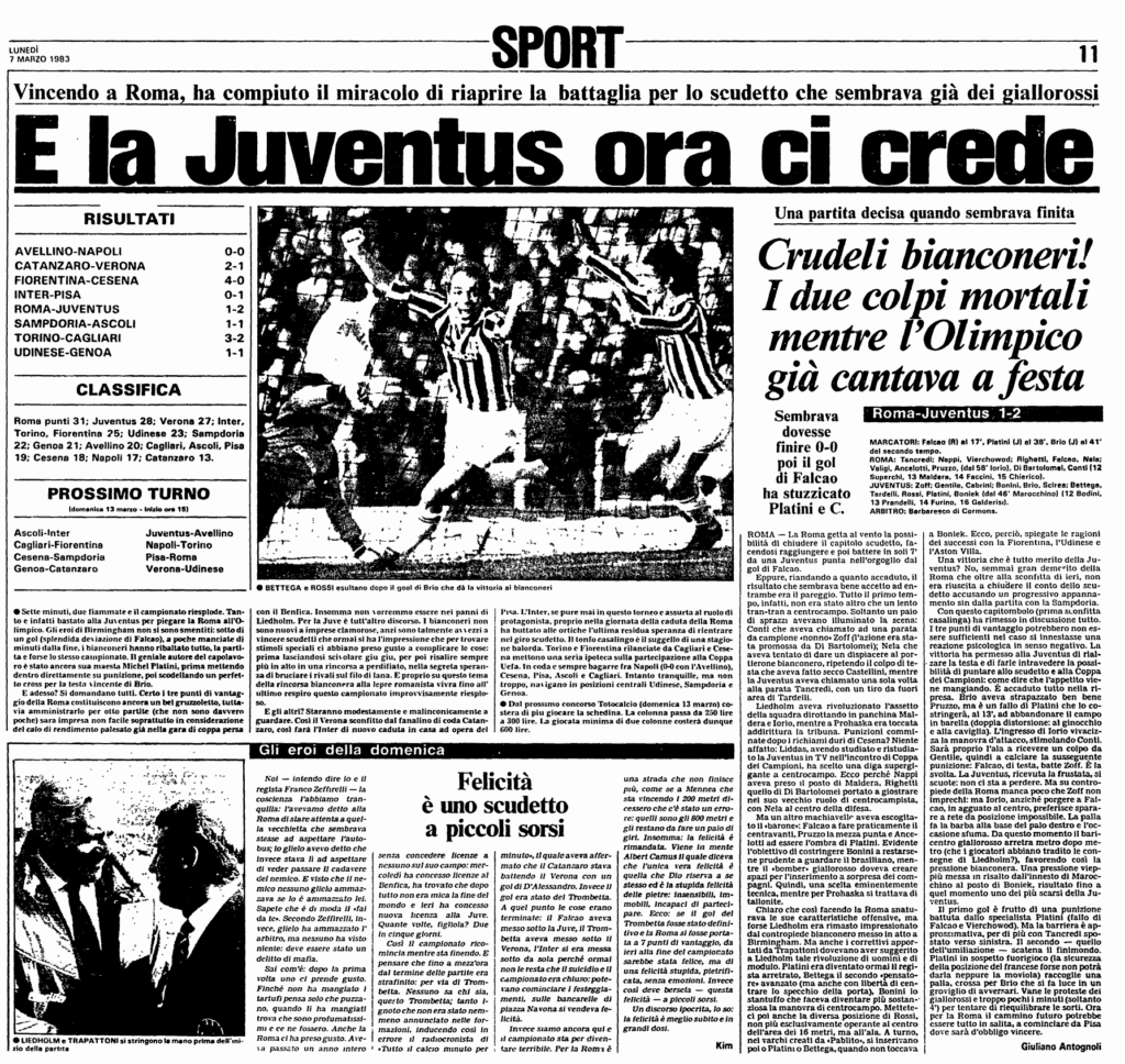 È la partita che potrebbe dare alla Roma il pass quasi definitivo per lo scudetto. Settima giornata di ritorno, i giallorossi si presentano al match forti di un vantaggio di 5 punti sui bianconeri primi inseguitori. La Roma gioca meglio, crea più opportunità e va in vantaggio con Falcao. Ma quando oramai sembra fatta, la Juventus ha un sussulto d’orgoglio e trascinata dal genio di Platini ribalta la contesa. Il campionato è riaperto, ma la Juventus non riuscirà a coronare la rimonta e la Roma a maggio festeggerà il secondo scudetto della sua storia.